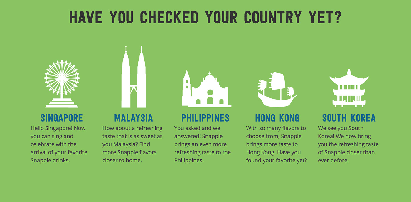 As part of the web development team of HIT Interactive Marketing Group, I was in charge of the development of the global websites for Snapple.